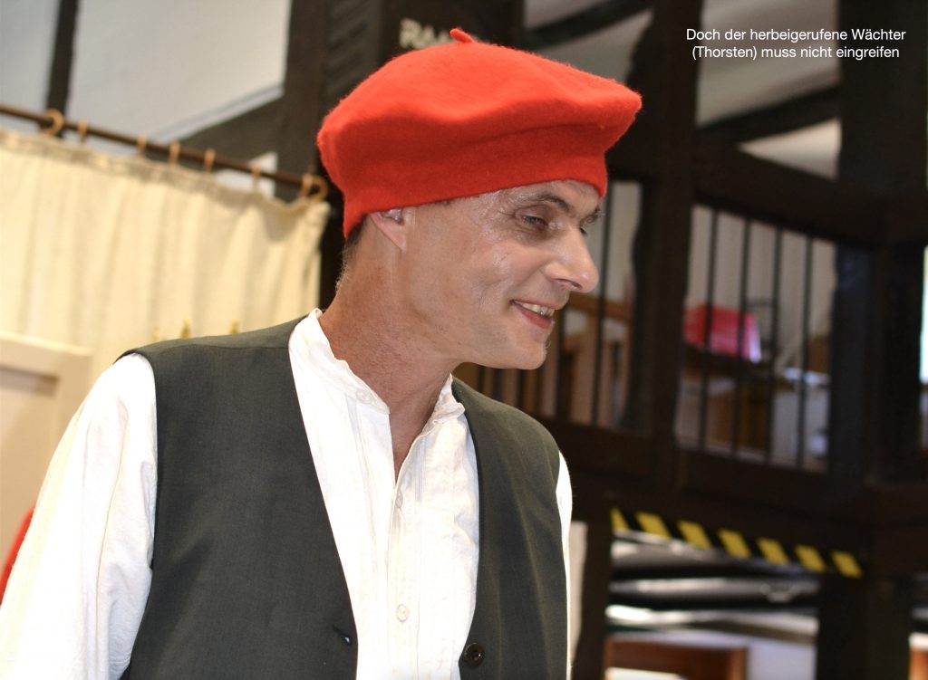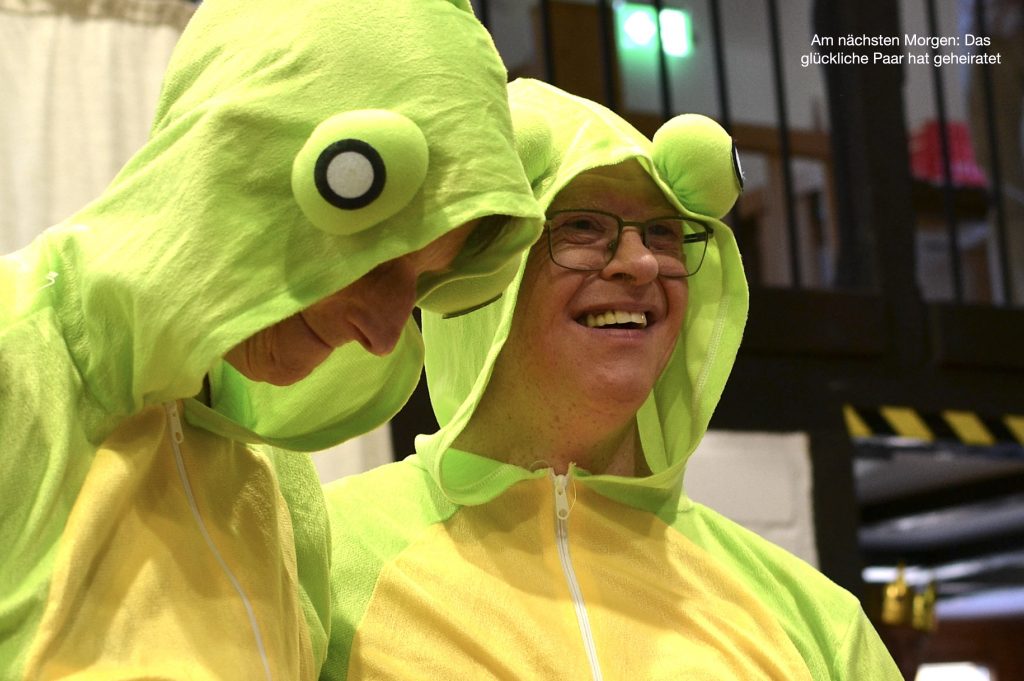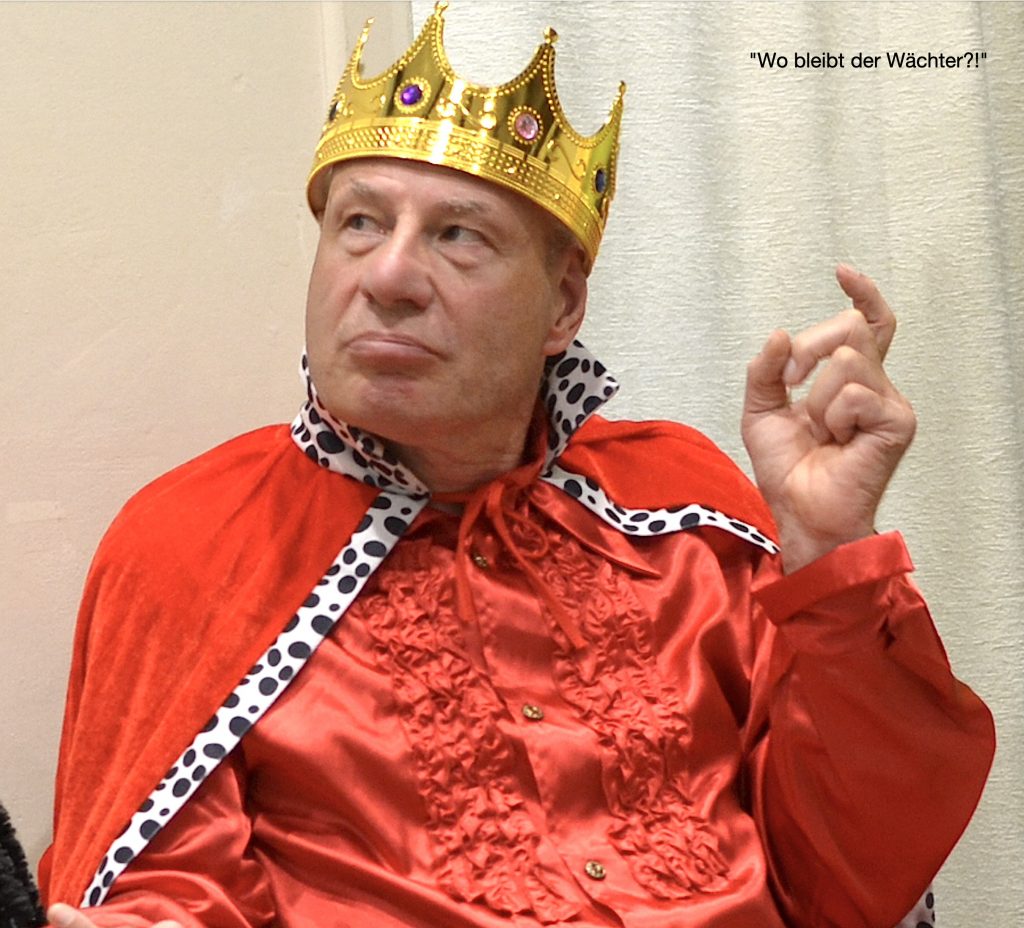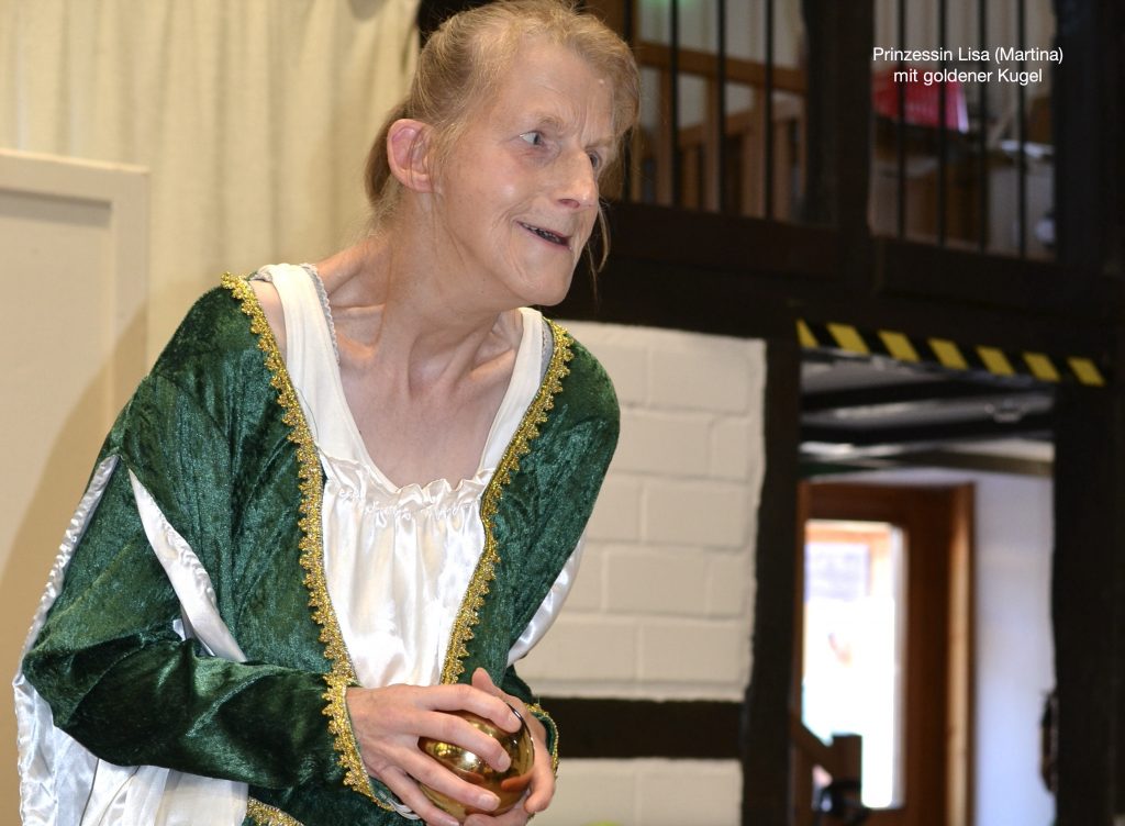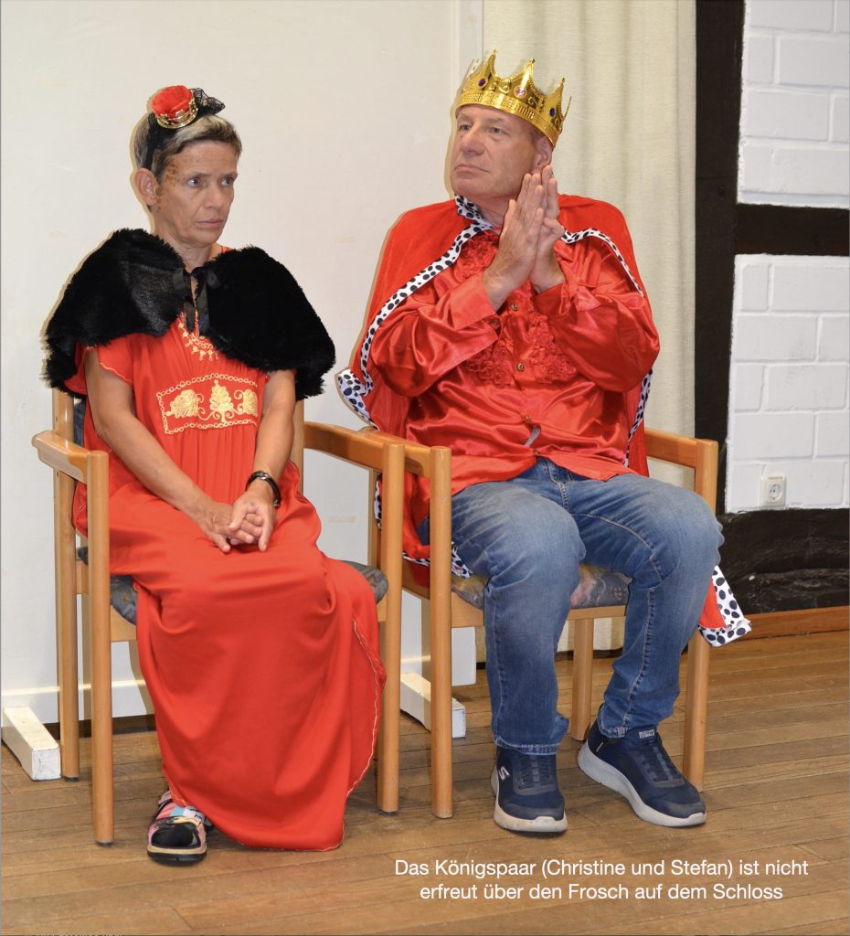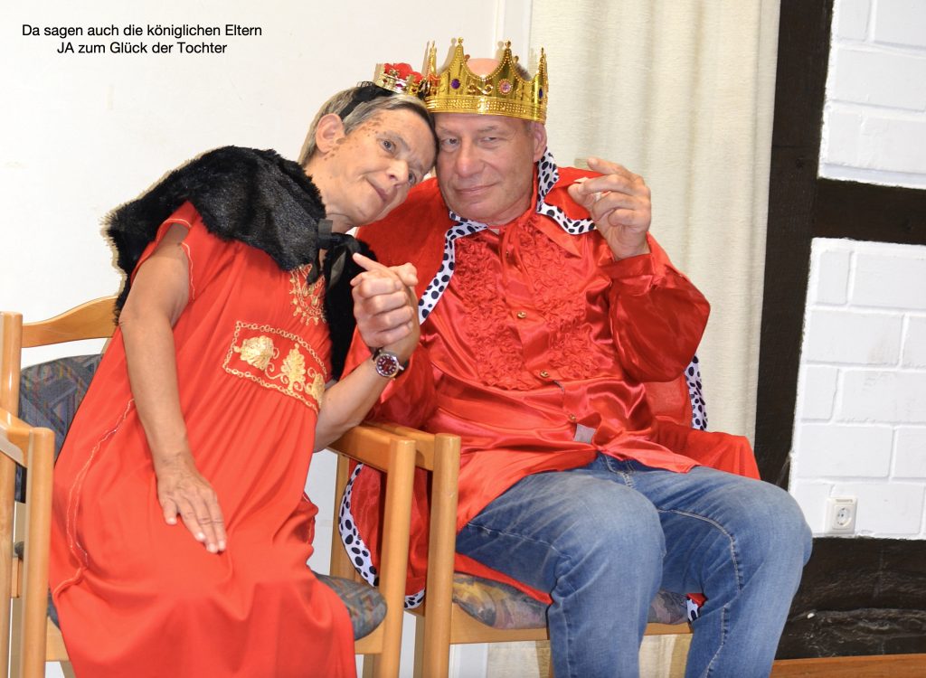 Wir wissen allerdings auch, dass Eltern über unliebsame Schwiegersöhne kaum erfreut sind. Nicht anders ergeht es der Königin (Christine) und dem König (Stefan) im neuen Stück. „Wer ist das? – Was will der hier?“ fragen sie ihre Tochter streng und ordern sogleich die Wache (Thorsten) herbei. Nachdem Lisa jedoch erzählt hat, wie alles kam, gibt es für sie kein Pardon. „Versprochen ist versprochen, jetzt nimm ihn mit auf dein Zimmer“, befiehlt das Königspaar der Tochter.