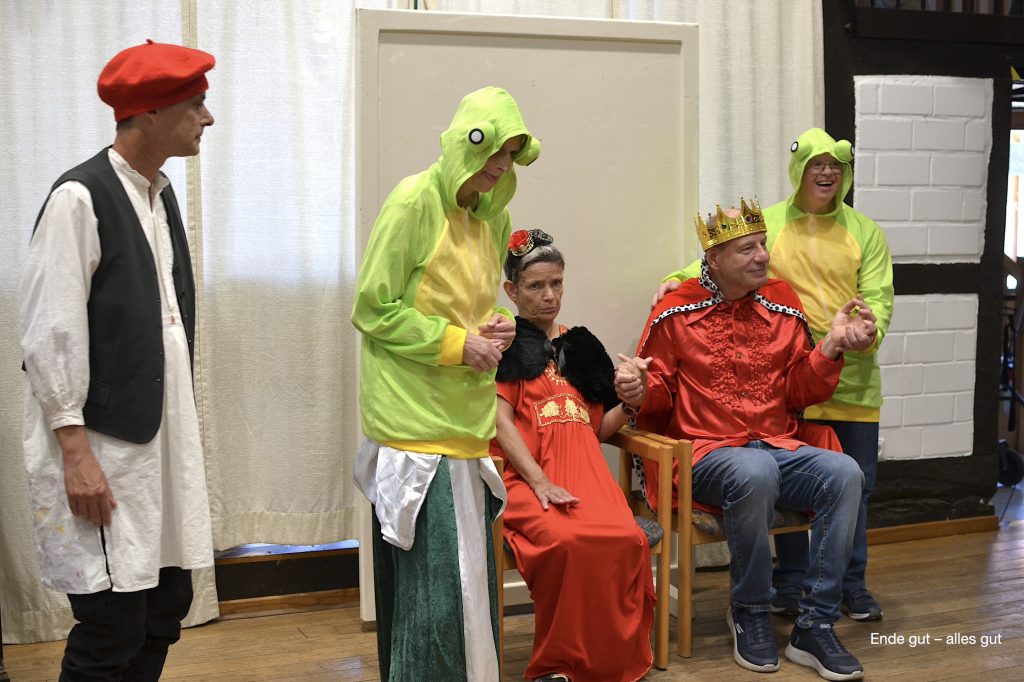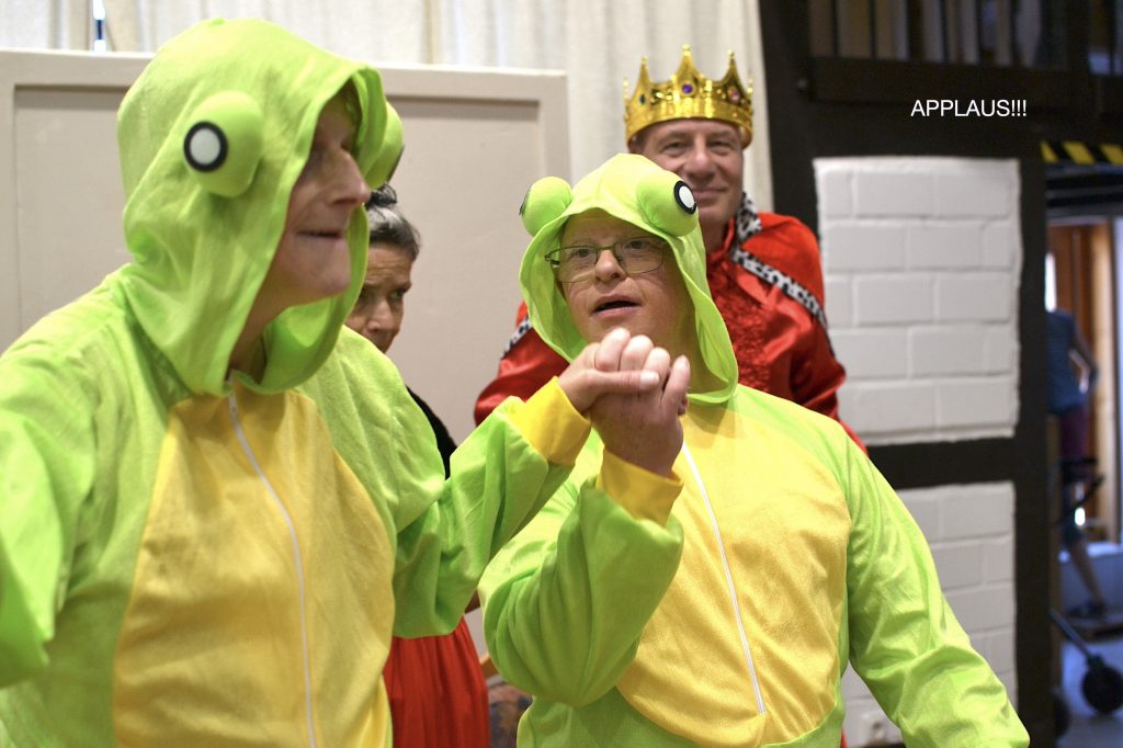 Dann geht`s los! Andrea Leonhardt tritt unter Beifall vor die Zuschauer*innen und verrät erstmal, dass sie zusammen mit der Theatergruppe jedes Jahr zwei neue Stücke auf die Bühne bringt. Alle Achtung! Denn dahinter steckt immer jede Menge Entwicklungs- und Probenarbeit. Nun also das neue Stück vom Kaspar, der in seinem Froschteich auf der Suche nach der großen Liebe ist. Einige Male haben sie damit in den letzten Wochen schon Generalprobe gehabt, zum Beispiel u.a. auf der „Woche der Begegnung“ in Diesdorf. Und nach der heutigen offiziellen Premiere werden weitere Vorstellungen folgen. „Wir sind derzeit sehr gut gebucht“, sagt Andrea Leonhardt nicht ohne Stolz. Dann gibt sie die Bühne frei.