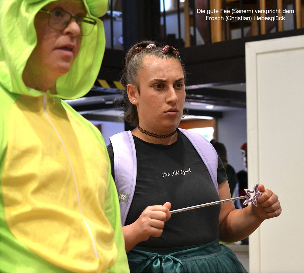 Auftritt Kaspar (Christian) im quietschegrünen Froschkostüm: Frank und frei wiegt er sich im Takte der erklingenden Musik, er scheint glücklich zu sein. Doch weit gefehlt. „Ich bin so einsam“, quakt der Frosch schließlich traurig. Da weissagt ihm plötzlich eine gute Fee (Sanem), dass ihm eine güldene Kugel das Glück bringen werde. So verschwindet Kaspar voller Hoffnung in seinem Teich. Und das keine Sekunde zu früh. Denn schon springt Prinzessin Lisa (Martina) fein gewandet heran, um fröhlich mit ihrem goldenen Ball zu spielen. Aber ach – nur eine kleine Ungeschicklichkeit und platsch versinkt der Ball im Teich. Jetzt ist guter Rat teuer. Wir wissen schon aus dem Märchen „Der Froschkönig“, wie die Geschichte weitergeht: Zwar holt der Frosch für die Prinzessin die goldene Kugel wieder herauf, aber dafür muss sie ihn mit auf ihr Schloss nehmen.