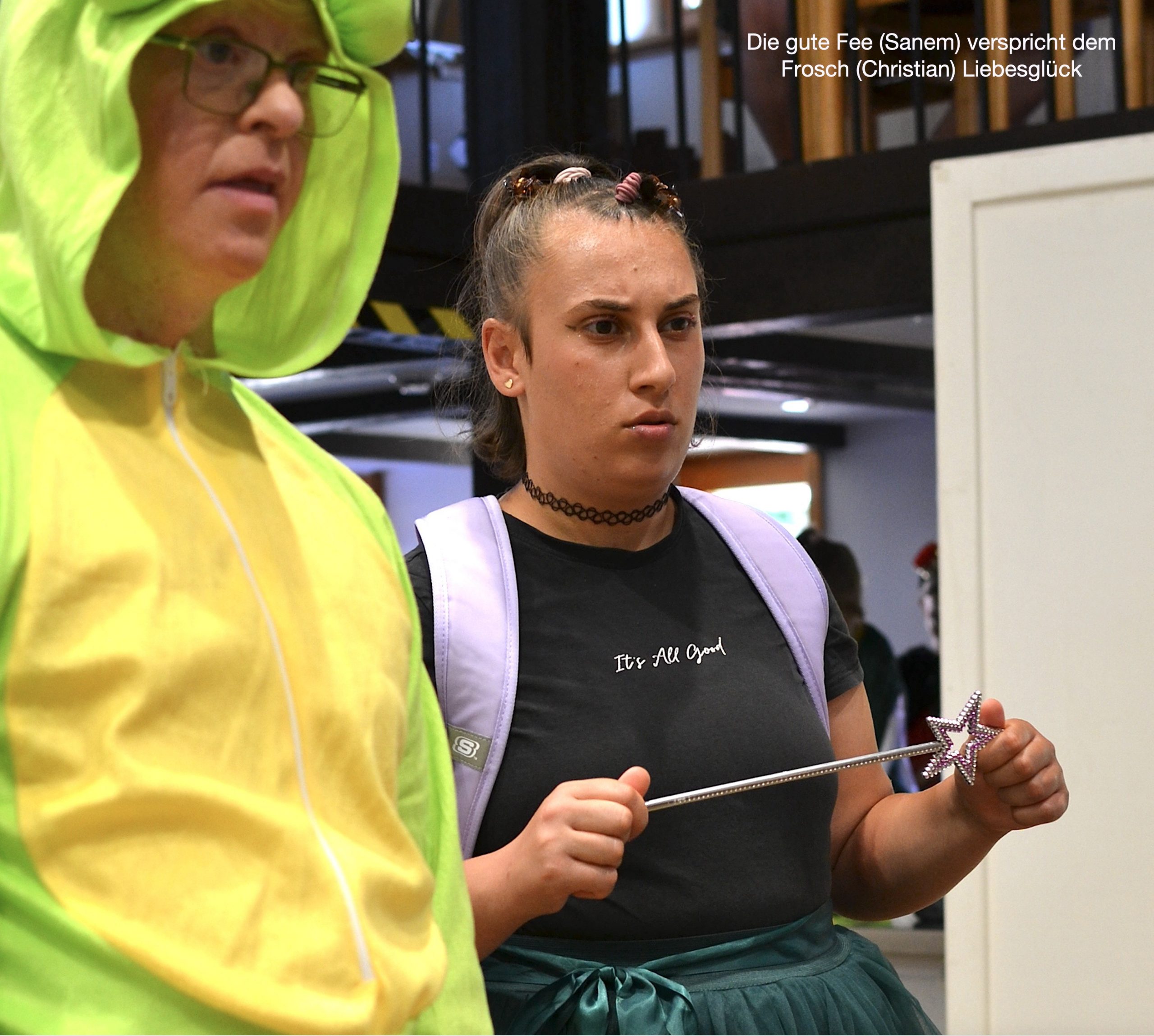 Auftritt Kaspar (Christian) im quietschegrünen Froschkostüm: Frank und frei wiegt er sich im Takte der erklingenden Musik, er scheint glücklich zu sein. Doch weit gefehlt. „Ich bin so einsam“, quakt der Frosch schließlich traurig. Da weissagt ihm plötzlich eine gute Fee (Sanem), dass ihm eine güldene Kugel das Glück bringen werde. So verschwindet Kaspar voller Hoffnung in seinem Teich. Und das keine Sekunde zu früh. Denn schon springt Prinzessin Lisa (Martina) fein gewandet heran, um fröhlich mit ihrem goldenen Ball zu spielen. Aber ach – nur eine kleine Ungeschicklichkeit und platsch versinkt der Ball im Teich. Jetzt ist guter Rat teuer. Wir wissen schon aus dem Märchen „Der Froschkönig“, wie die Geschichte weitergeht: Zwar holt der Frosch für die Prinzessin die goldene Kugel wieder herauf, aber dafür muss sie ihn mit auf ihr Schloss nehmen.